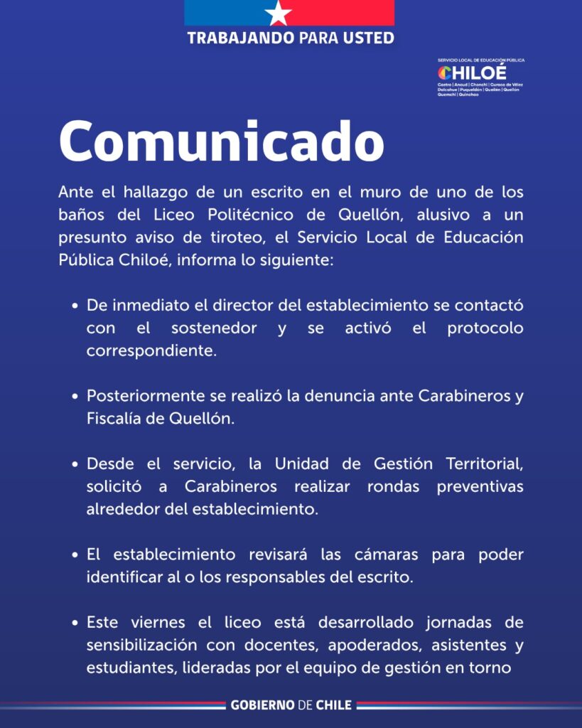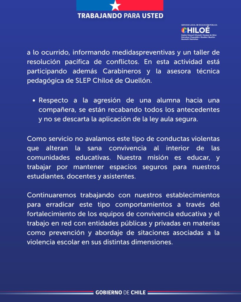 Como servicio no avalamos este tipo de conductas violentas que alteran la sana convivencia al interior de las comunidades educativas. Nuestra misión es educar, y trabajar por mantener espacios seguros para nuestros estudiantes, docentes y asistentes.